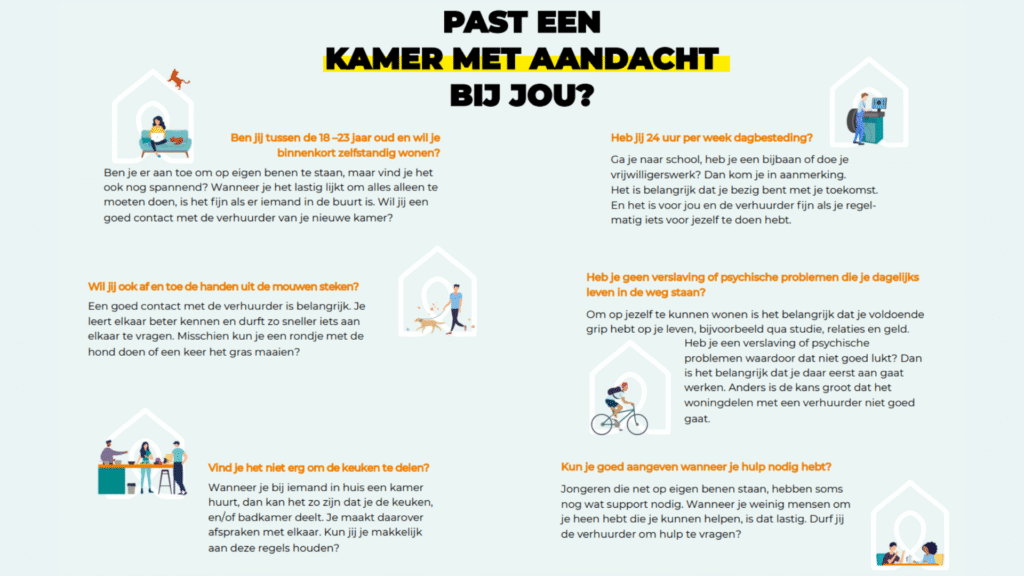 Zo mag je van sommige verhuurders geen huisdieren of is binnen roken niet toegestaan. Ook vinden we het belangrijk dat je geen verslaving of psychische problemen hebt die je dagelijks functioneren belemmert.