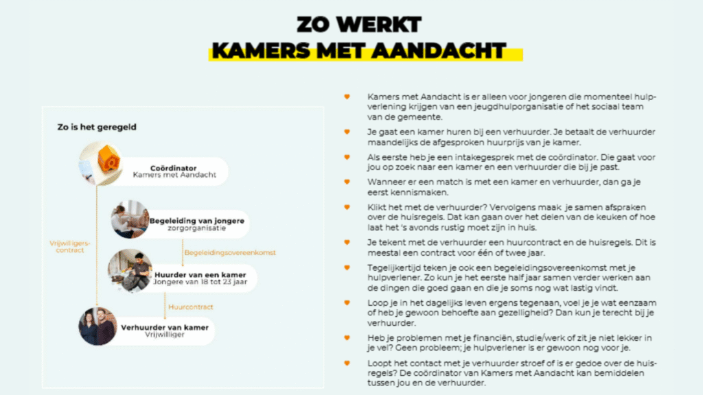 Als je gebruik maakt van een Kamer met Aandacht, is het belangrijk dat jij je houdt aan de afspraken in het begeleidingscontract. Dit houdt in ieder geval in dat je:Â