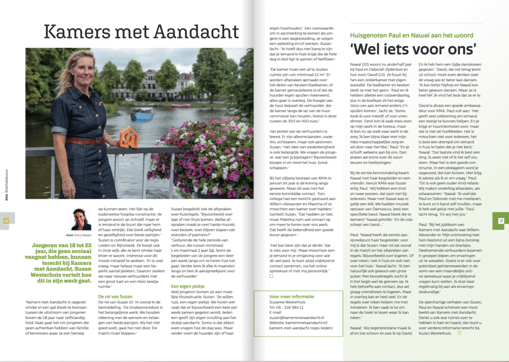 Stichting Kamers met Aandacht is een non-profitorganisatie en helpt kwetsbare jongeren op weg naar zelfstandigheid. Daarom zoeken wij mensen die een kamer willen verhuren aan jongeren tussen de 18 en 23 jaar, die op eigen benen willen staan, maar nog niet geheel zelfstandig kunnen wonen. Een kamer mét aandacht! Kamers met Aandacht heeft een ANBI status en is door het CBF erkend als Goed Doel.
